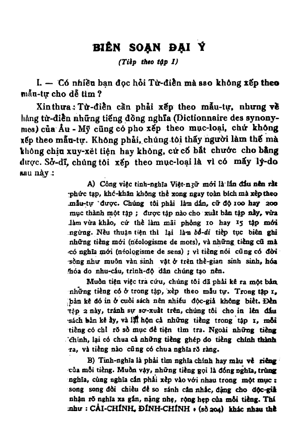 Soạn giả nói: “Muốn có một nền học thuật hoàn mỹ thuần túy Việt Nam, xứng đáng một dân tộc độc lập, quốc văn cần phải như những tiếng của các nước Âu Mỹ, phân minh, rành rọt: tiếng nào nghĩa ấy, mỗi tiếng có một nghĩa riêng, không có tiếng nào thực đồng nghĩa.”